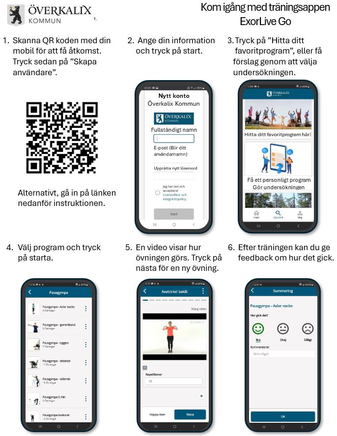 Kom igång med träningen – använd vår träningsapp. Här finns träningsprogram med olika svårighetsgrader. Du kan välja att träna hemma, utomhus, styrketräning, konditionsträning eller balansträning. Det finns något för alla, oavsett om du är yngre, äldre, har en funktionsnedsättning.
