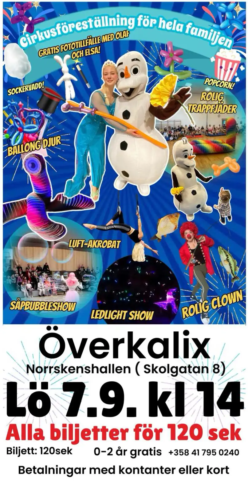 Cirkusföreställning Norrskenshallen lördag 7 september klockan 14.00. Biljettpris 120 kronor - kontant eller kort. Biljettförsäljningen startar klockan 13.30. Barn 0-2 år gratis.