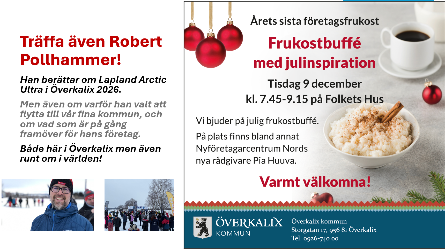 Välkommen till årets sista företagsfrukost tisdag 9 december klockan 7.45-9.15 på Folkets hus i Överkalix.