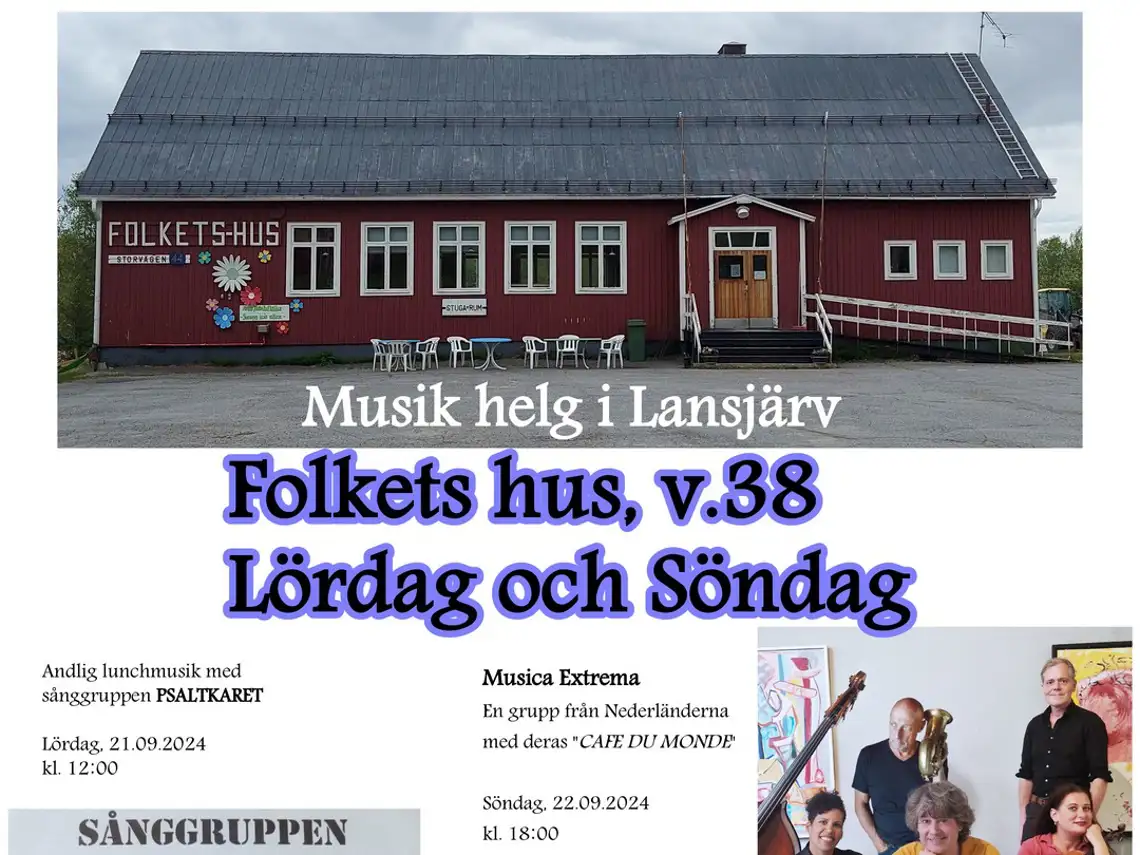 Musikhelg i Lansjärvs Folkets Hus lördag, Gratis entré. 21 september klockan 12.00 och söndag den 22 september klockan 18.00.