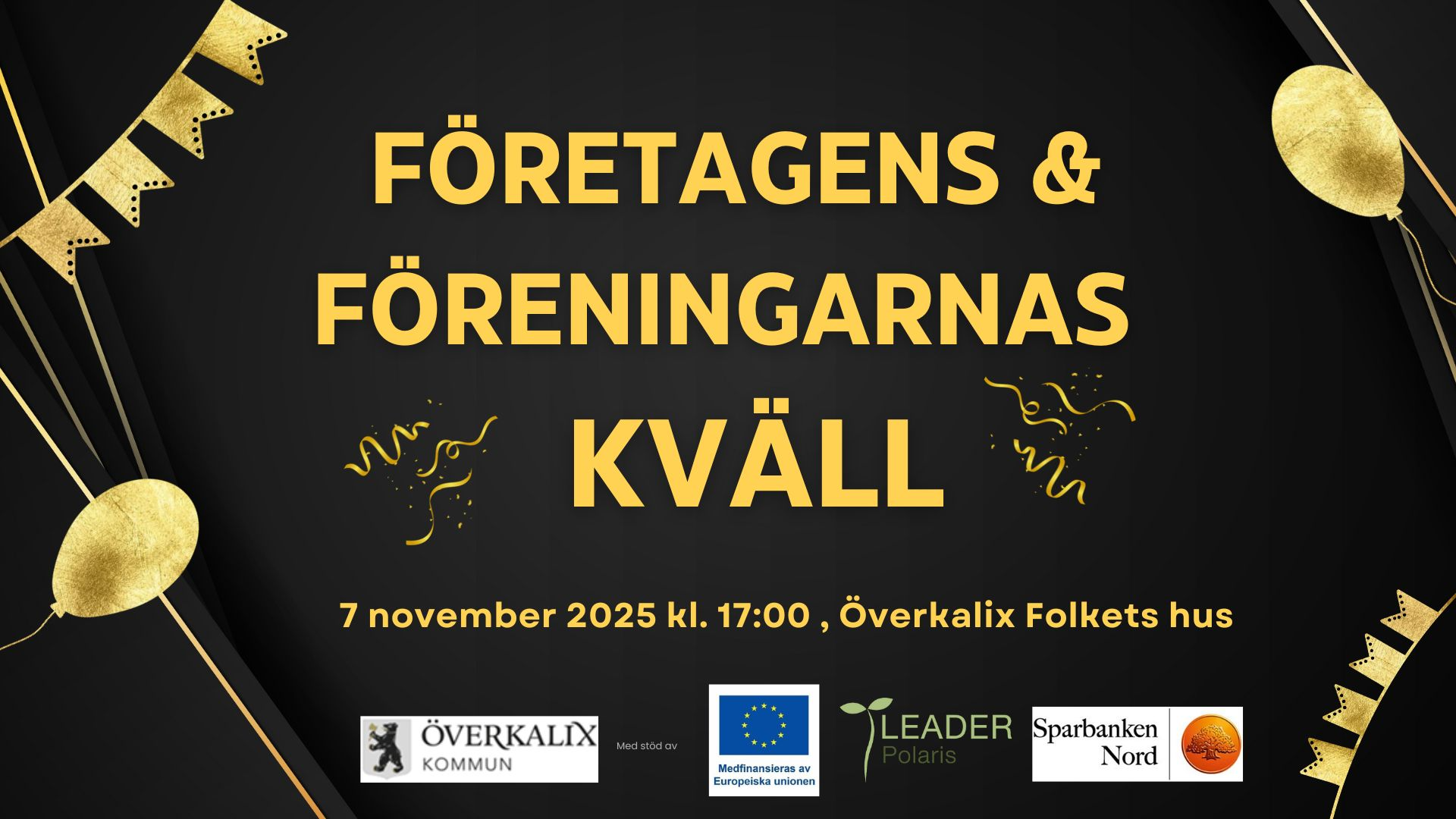 Fredagen den 7/11 kl. 17:00 går Företagens och Föreningarnas kväll av stapeln på Folkets Hus i Överkalix. På plats finns bland andra Anna-Karin Lindqvist, före detta OS-Simmare, professor på LTU och egenföretagare, som berättar om sina nycklar till framgång – vare sig det gäller i simbassängen eller på kontoret. Magnus Nordlund med band står för underhållningen hela kvällen och Reine Sundqvist guidar oss med trygg hand genom momenten som konferencier. Tillsammans avnjuter vi en härlig middag och delar ut priser till lokala företagare och föreningsrepresentanter som utmärkt sig under året.