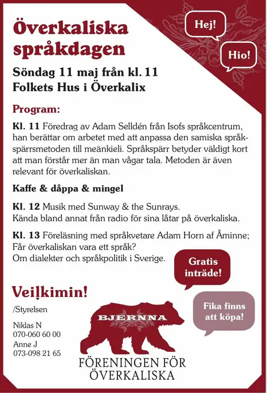 11.00 Föredrag av Adam Selldén från Isofs språkcentrum, han berättar om arbetet med att anpassa den samiska språkspärrmetoden till meänkieli. Språkspärr betyder väldigt kort att man förstår mer än man vågar tala. Metoden är även relevant för överkaliskan.