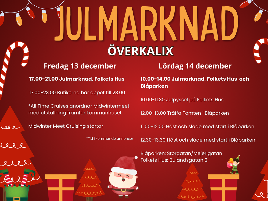 Förutom julmarknaden i folkets hus Bulandsgatan 2 och Blåparken Storgatan 5 kommer butikerna i Överkalix att ha kvällsöppet till 23.00 på fredagen den 13 december, en tradition som lockar många besökare.