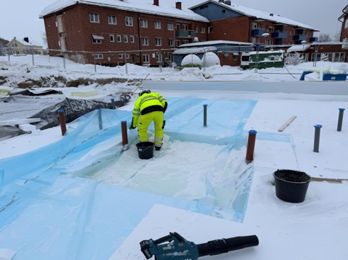 Trots vinterns stränga kyla går produktionen bra, just nu pågår gjutning av grunden och inom kort är det dags för att börja resa de första delarna av stommen till byggnaden.