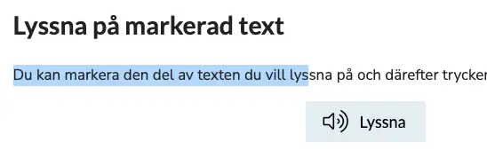 Du kan markera den del av texten du vill lyssna på och därefter trycka på den lyssna-knapp som då visas bredvid muspekaren. När du trycker på knappen visas en spelare (se bilden nedan) och ReadSpeaker börjar läsa upp den text du har markerat.