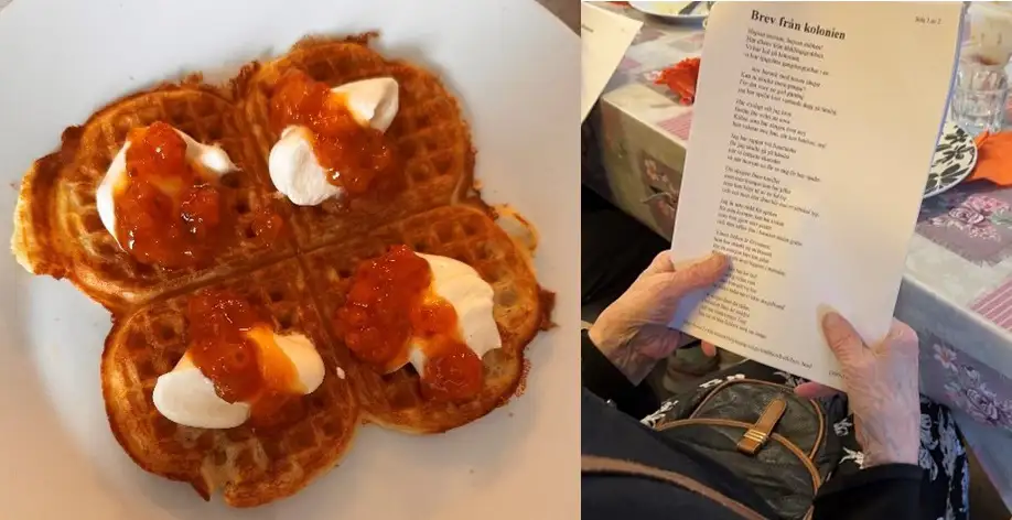 I veckan bjöds det på våffelfest med goda tillbehör. Den goda hemkokta hjortronsylten har två av de boende bidragit med. Vid sammankomsten är det 14 boende som deltar. En vacker ros pryder bordet, som lämnats där av en av de boende.