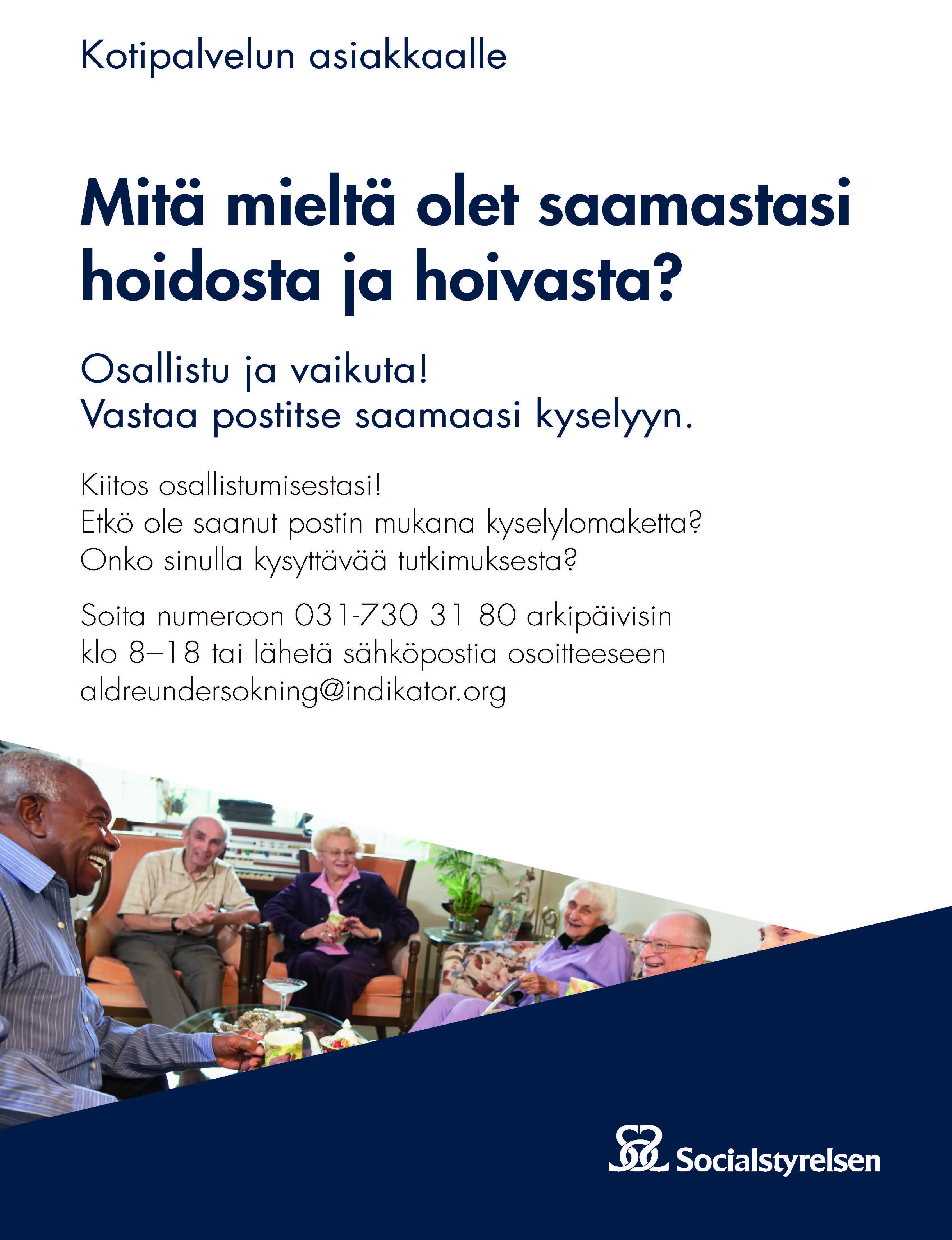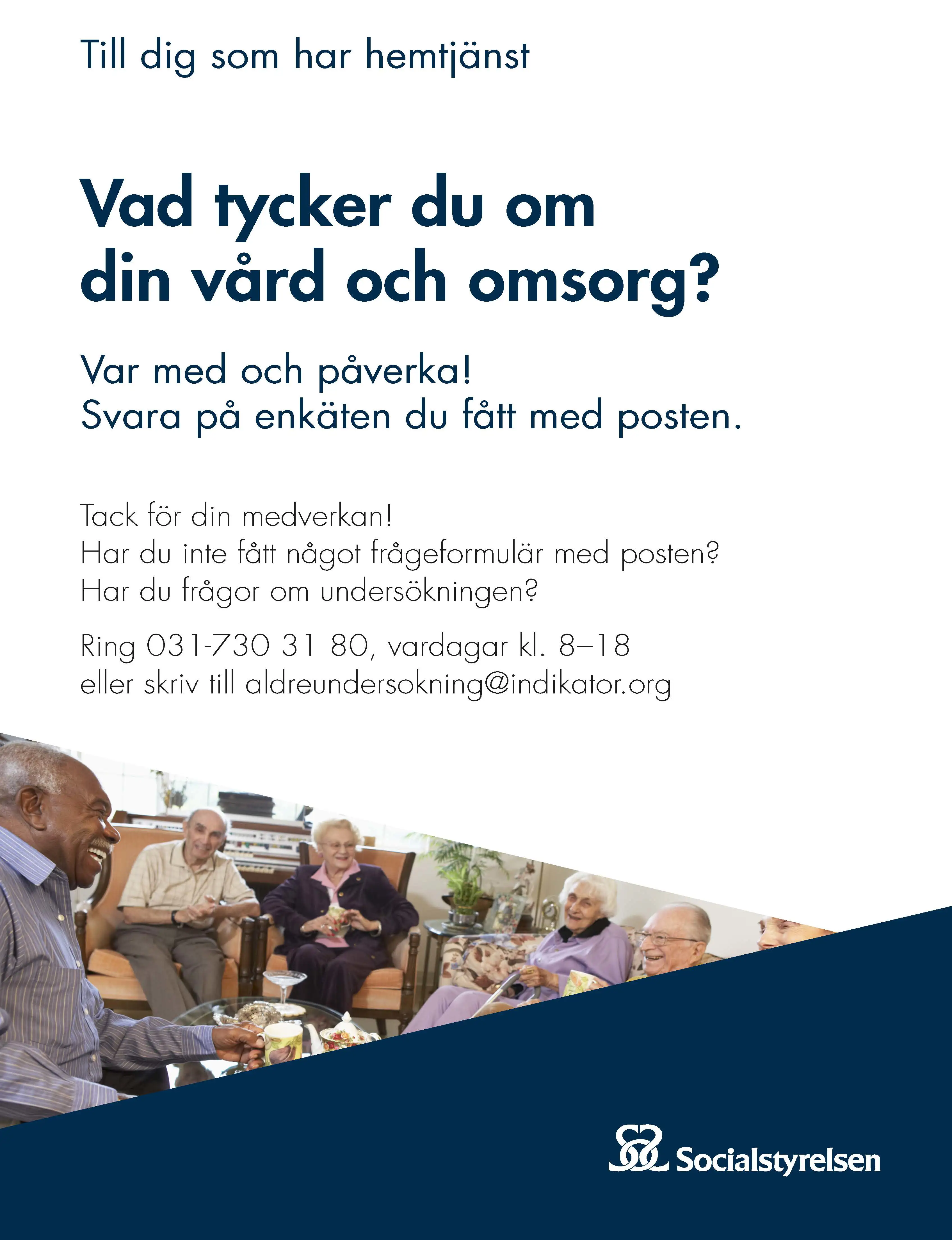 I slutet av nästa vecka (v.11) börjar pappersenkäterna att skickas ut till personer som är 65 år eller äldre och som har hemtjänst eller bor på särskilda boenden för äldre i Sverige. Eftersom enkäterna skickas till cirka 220 000 personer, kan det ta två veckor innan alla enkäter hunnit skickas och komma fram med posten. Enkäten skickas ut av Socialstyrelsen